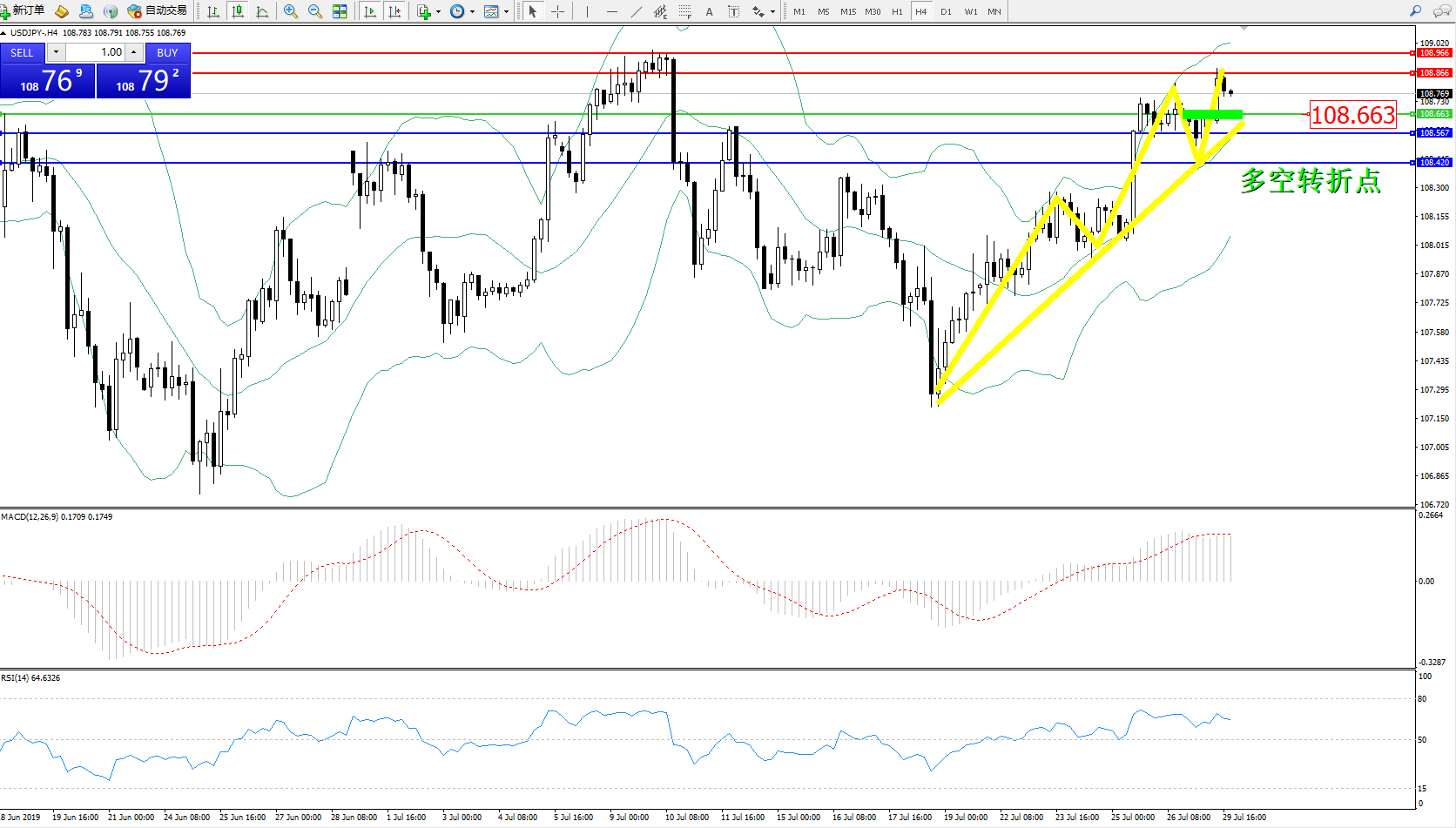 交易策略:108.663下方看跌,目标108.567108.420