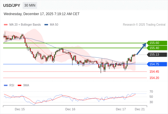 在 154.75 之上,看涨,目标价位为 155.40 ,然后为 155.60 。