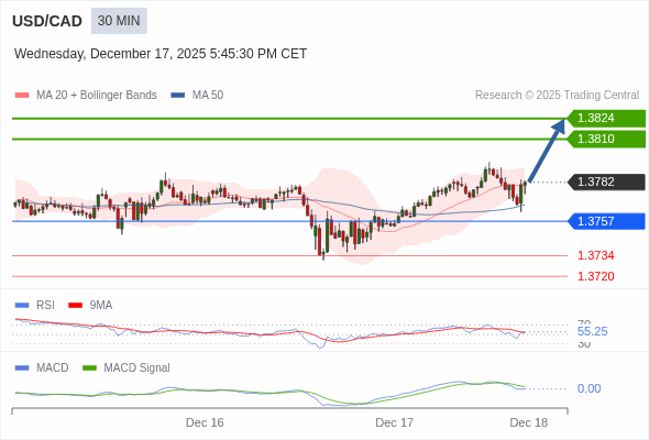 美元/加元 当日内 : 看涨,当 1.3757 为支撑位,目标定在1.3824。