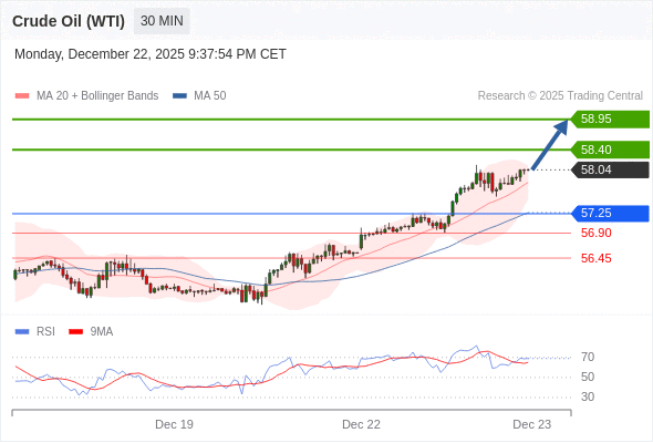 在 57.25 之上,看涨,目标价位为 58.40 ,然后为 58.95 。