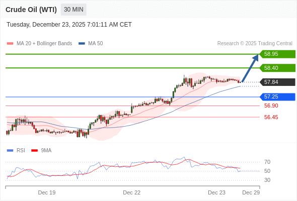 在 57.25 之上,看涨,目标价位为 58.40 ,然后为 58.95 。