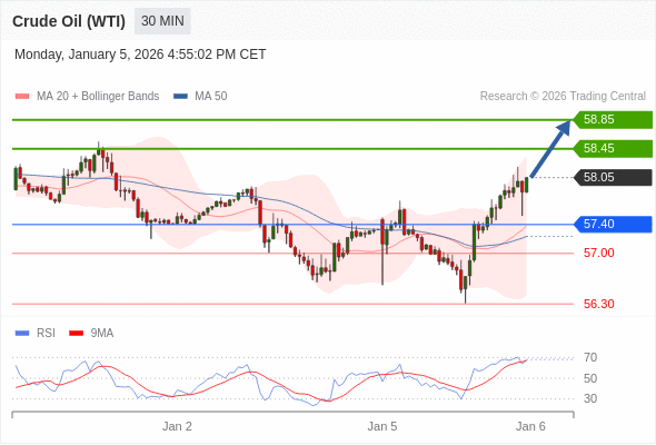 在 57.40 之上,看涨,目标价位为 58.45 ,然后为 58.85 。
