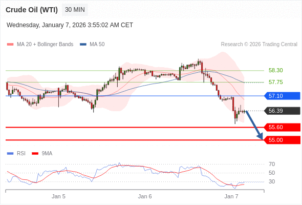 在 57.10 之下,看跌,目标价位为 55.60 ,然后为 55.00 。