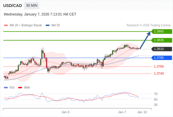 在 1.3785 之上,看涨,目标价位为 1.3835 ,然后为 1.3860 。