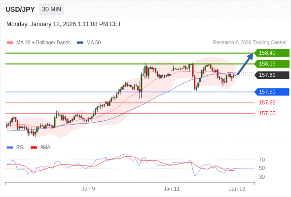在 157.50 之上,看涨,目标价位为 158.15 ,然后为 158.40 。