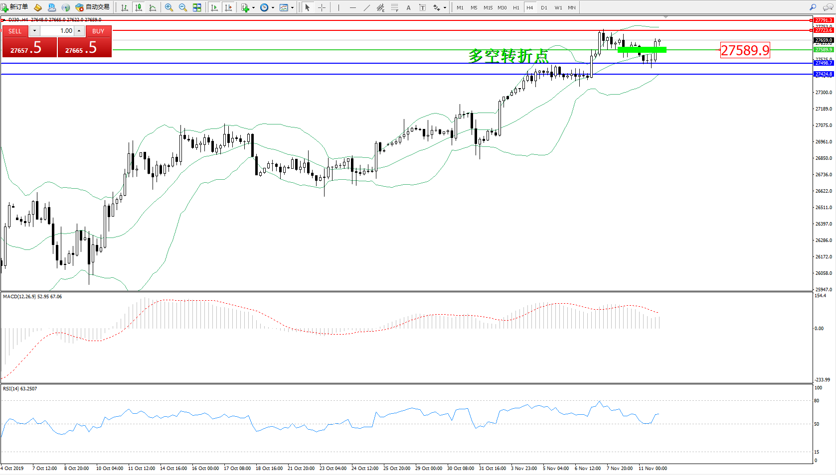 道琼斯指数DJ30—— 4小时K线图显示: