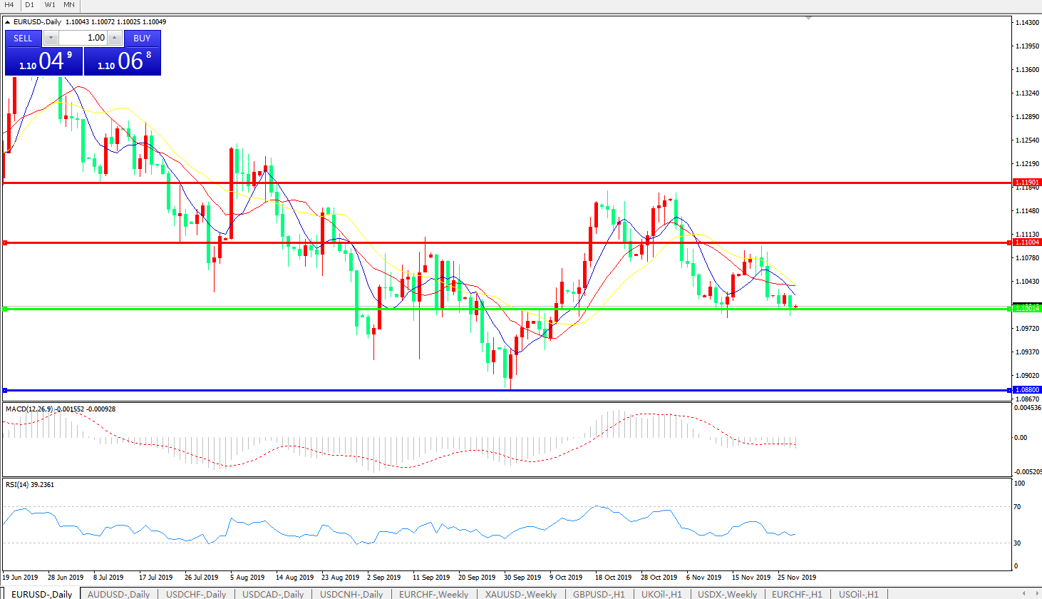 技术面简析:日图均线再度呈空头排列,汇价1.10关口弱势整理徘徊,MACD量能在0轴下方有持续放量的迹象 ,RSI低位窄幅走弱,预计汇价短期汇价将延续整理态势,关注1.1000关口争夺。