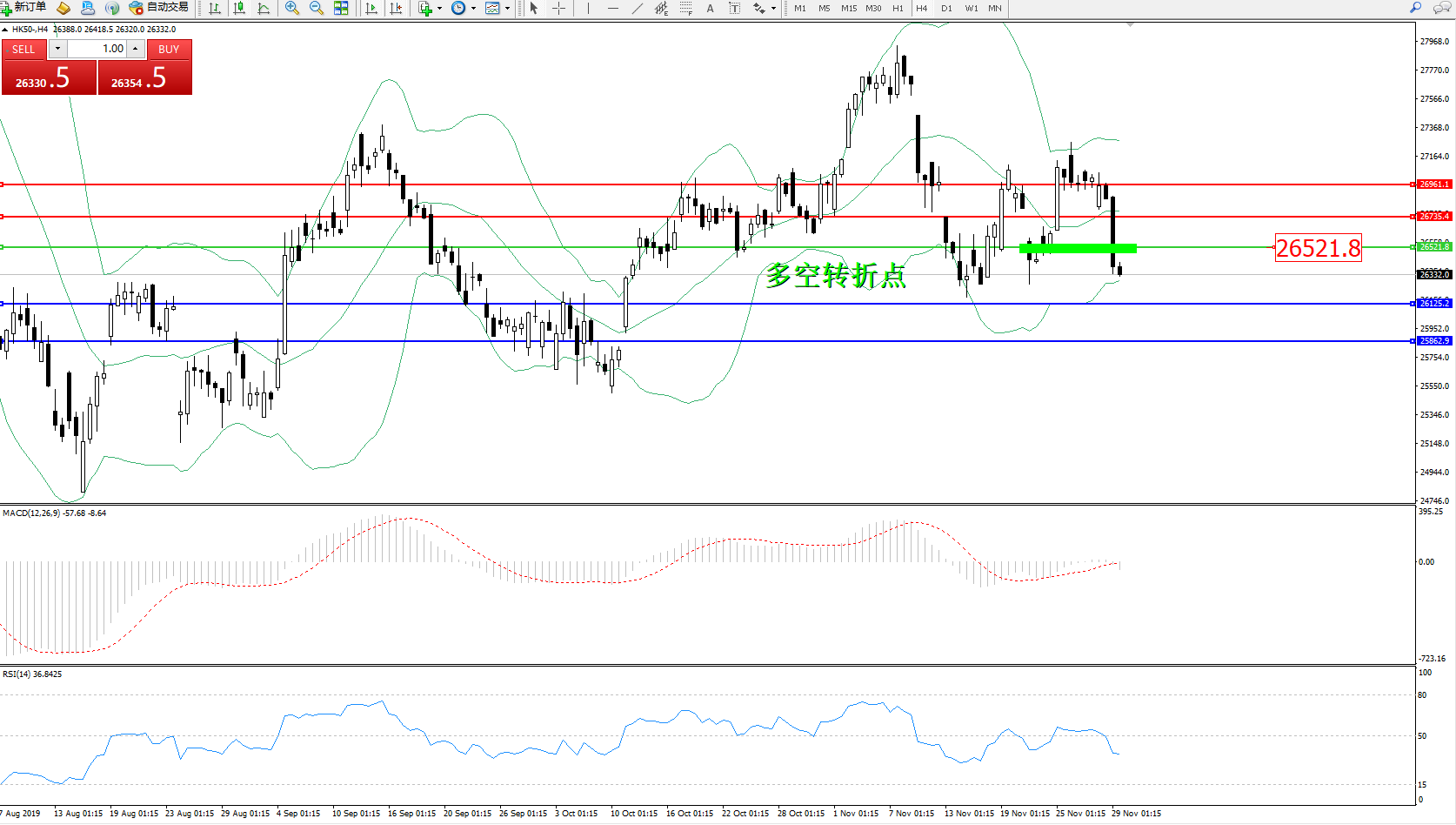香港恒生指数11月29日(周五)收盘下跌547.24点,跌幅2.03%,报26346.49点;港股低开188点后再延续跌势,并扩大跌幅。由于美国股市为感恩节假期休市,A股回落。在欠缺方向的情况下,股市出现大幅抛售,恒指越跌越深,低见26327,最多跌566点。由于仍见有向下的趋势,此刻不宜追入,极有机会下试26000关口。恒指开始走弱,在震荡市做交易确实性价比不高,太浪费精力而且风险收益比不高。留意美国零售销售行情,中港股市继续拉锯。