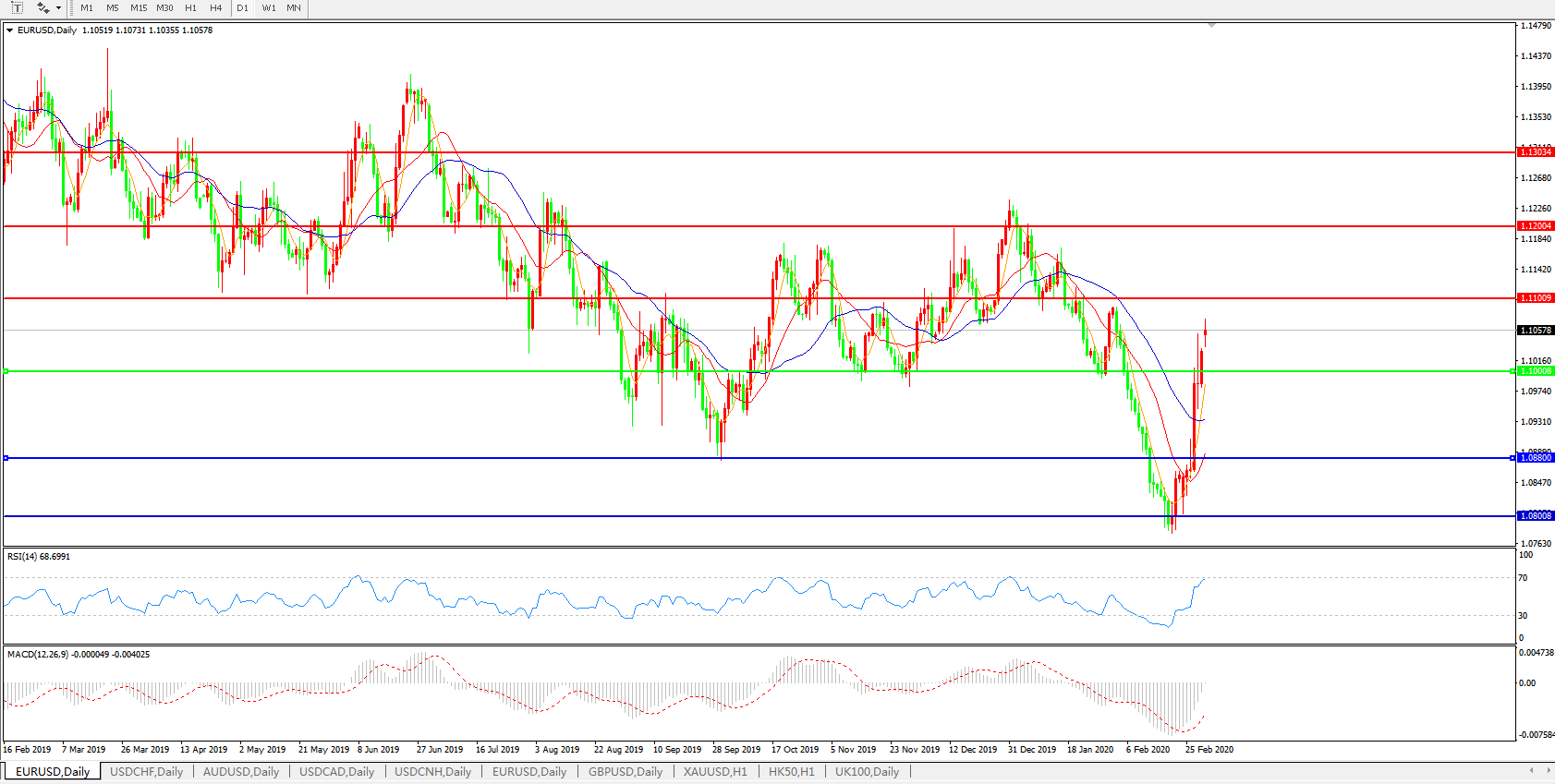 交易策略:1.1000上方看涨,目标1.1100、1.1200