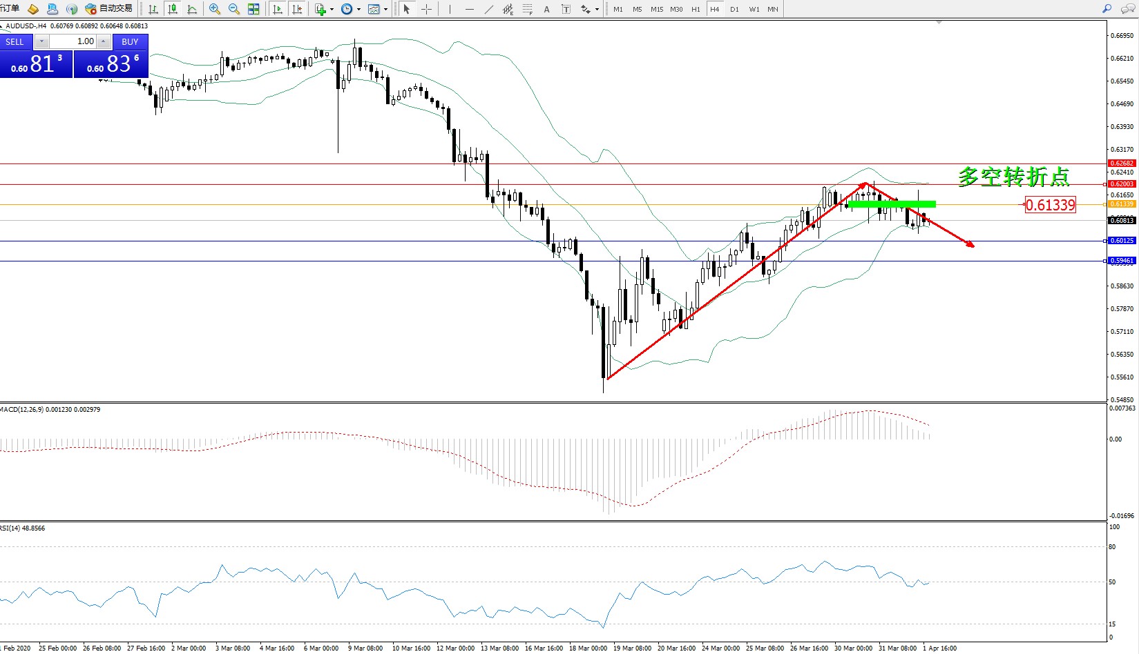 交易策略:0.61339下方看跌,目标0.60125、0.59461