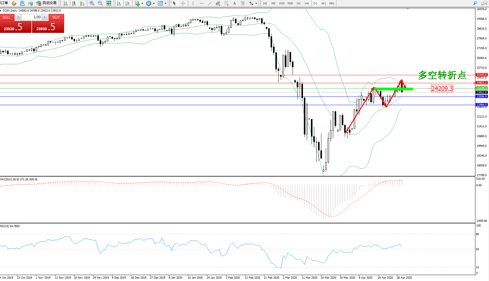 道琼斯指数430日(周四)收盘下跌288.10点,跌幅1.17%,报24345.72点。美国股市下挫,严峻的经济预警、疫情影响下糟糕的数据和企业业绩令股市承压,给二十余年来最佳月度表现划上了一个不太圆满的句号。此前美国公布的首次申请失业救济金人数大于预期。成分股中,下跌和上涨股的数量之比约为41;微软、Facebook、特斯拉的强劲业绩部分遏制了纳斯达克指数的跌势。市场猜测新冠疫情对经济的损害可能是短暂的。大型企业企业的强劲业绩令人感到鼓舞,但挑战依然存在。预计在可预见的将来,市场还会出现一番拉锯。