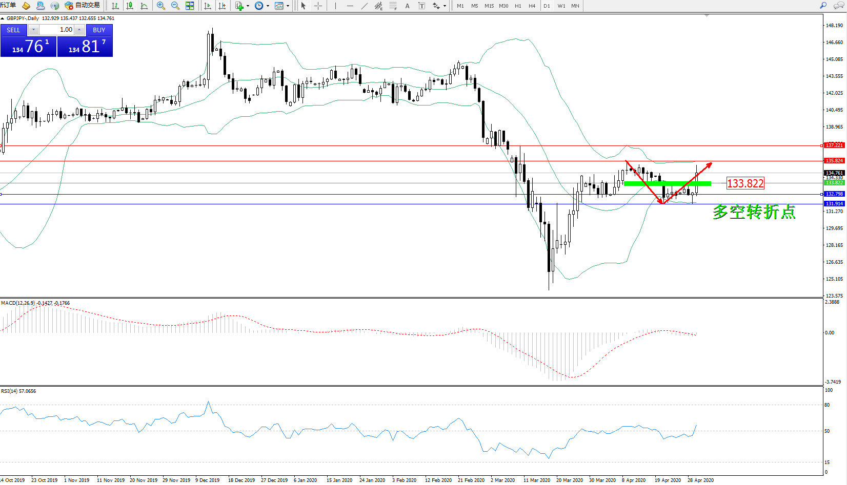 交易策略:133.822上方看涨,目标135.824、137.221