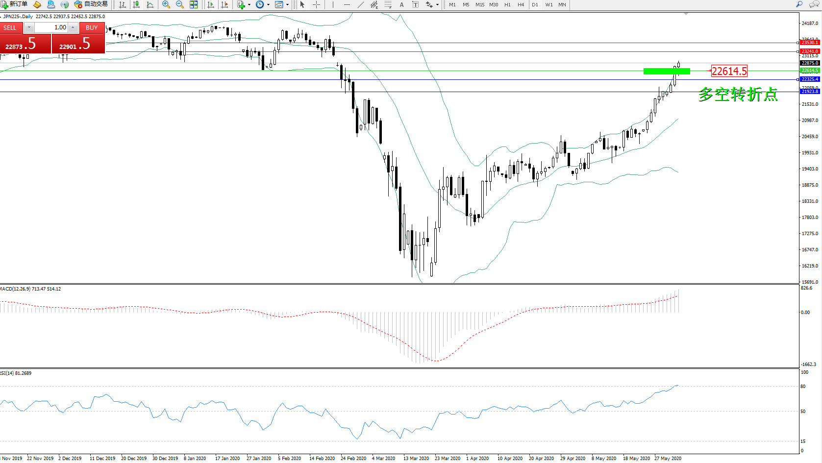 日经225指数6月3日(周三)收盘上涨293.39点,涨幅1.31%,报22619.00点。日本央行提供800亿日元1年期国债购买;日本央行提供3200亿日元3-5年期国债购买;日本央行提供1200亿日元10-25年期国债购买。市场风险偏好情绪继续回暖,资金纷纷涌入风险资产,全球股市继续集体走高,尽管美国骚乱不停止,但当下复工成全球主题,且经济恢复速度超此前预期,风险市场的好日子仍在继续,尽管涨势强劲,但随着股市本轮涨势范围扩展到美国以外的地区,这种势头很可能会持续下去。