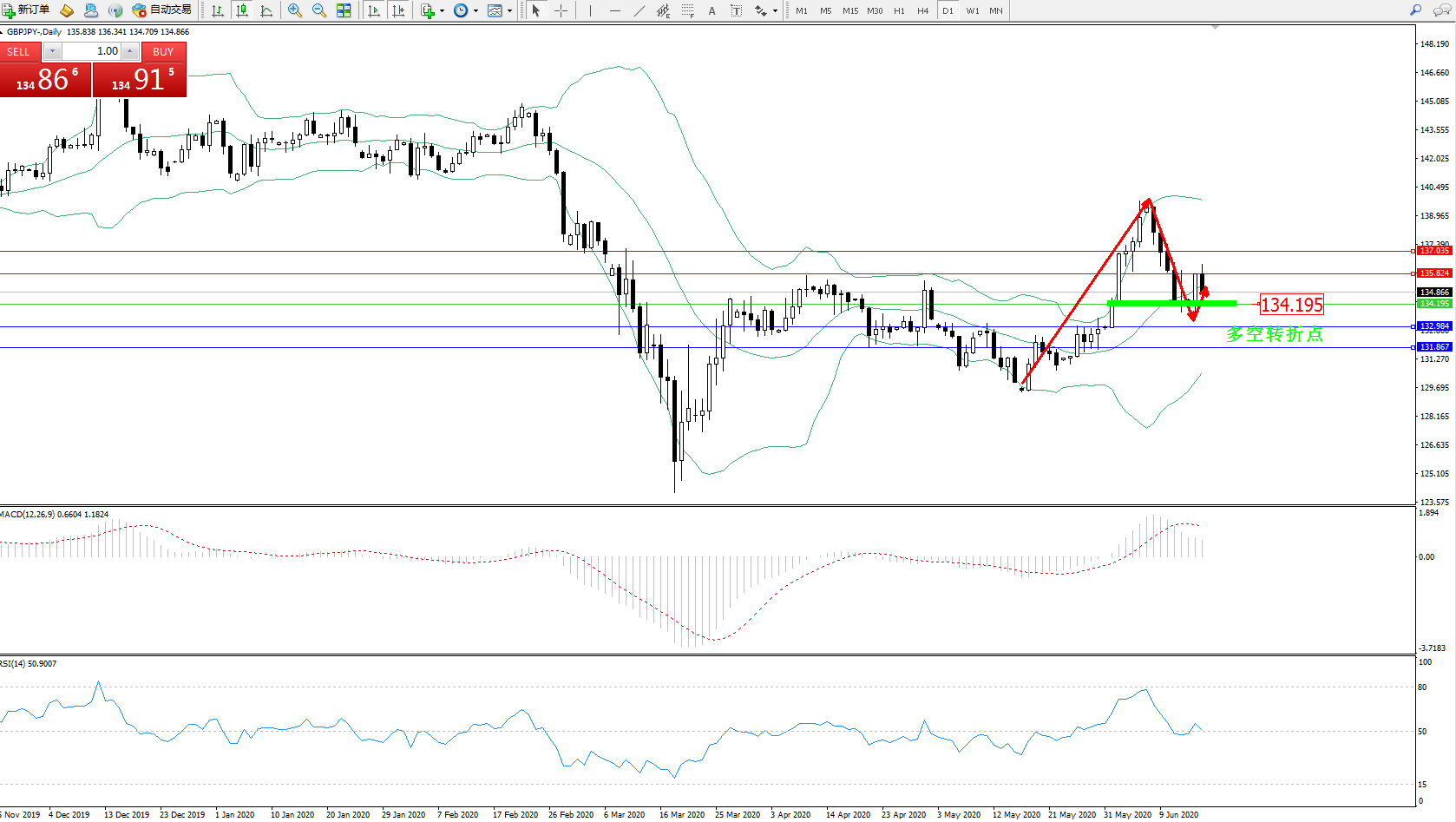 交易策略:134.195上方看涨,目标135.824137.035