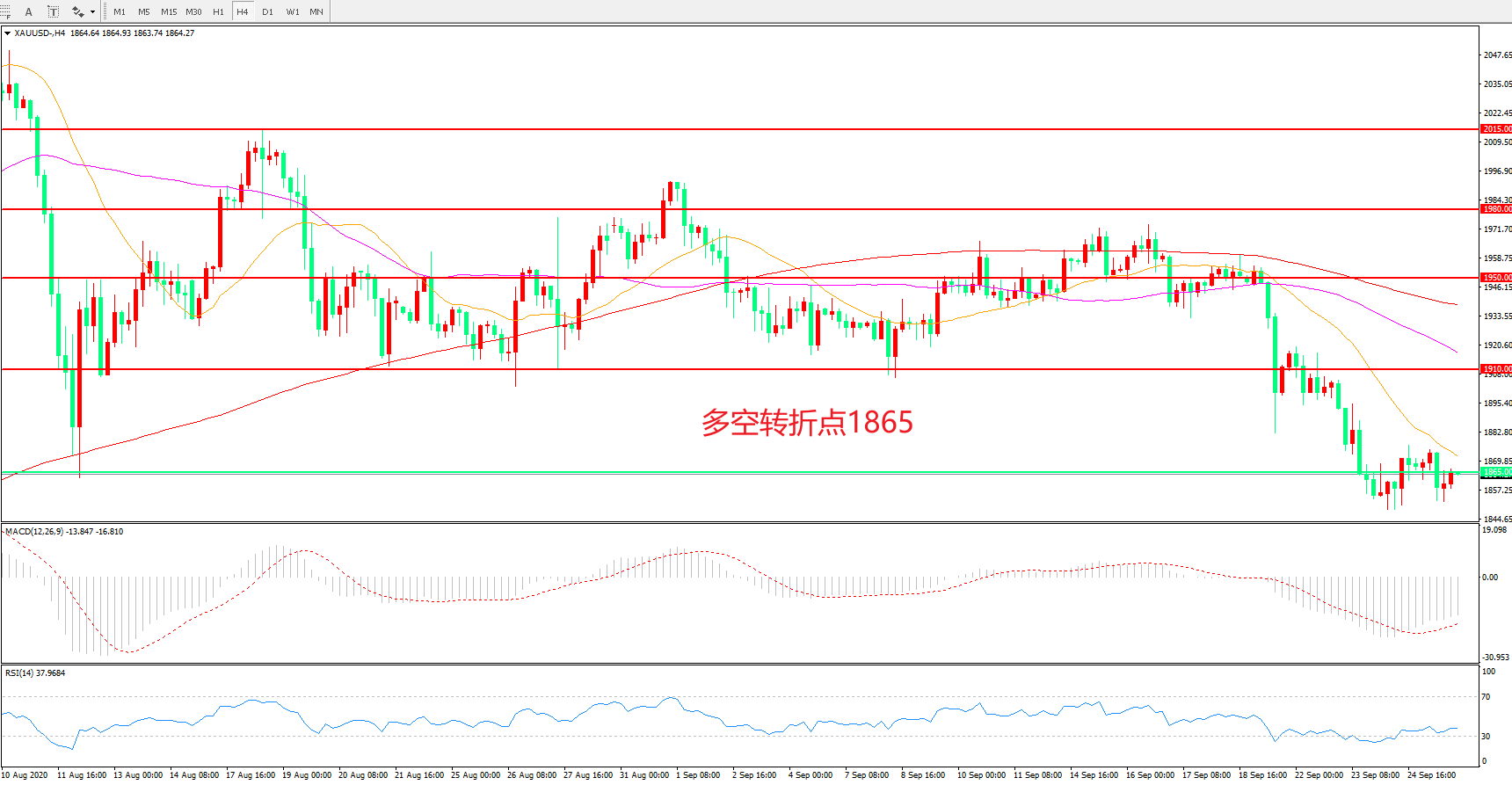 4小时图看,金价延续低位震荡,短期走势仍然低迷,1865一线成为多空分水岭,均线系统呈空头排列,MACD绿柱增加,RSI指标走平,近期延续震荡概率较大。