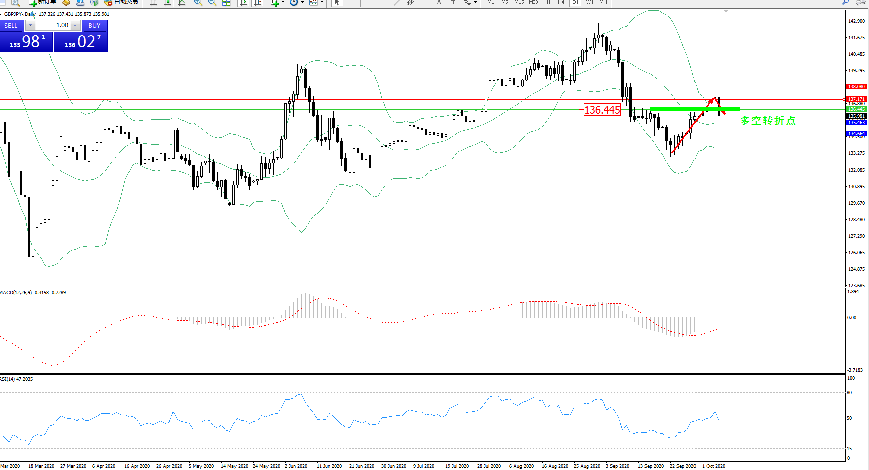 交易策略:136.445下方看跌,目标135.463、134.664