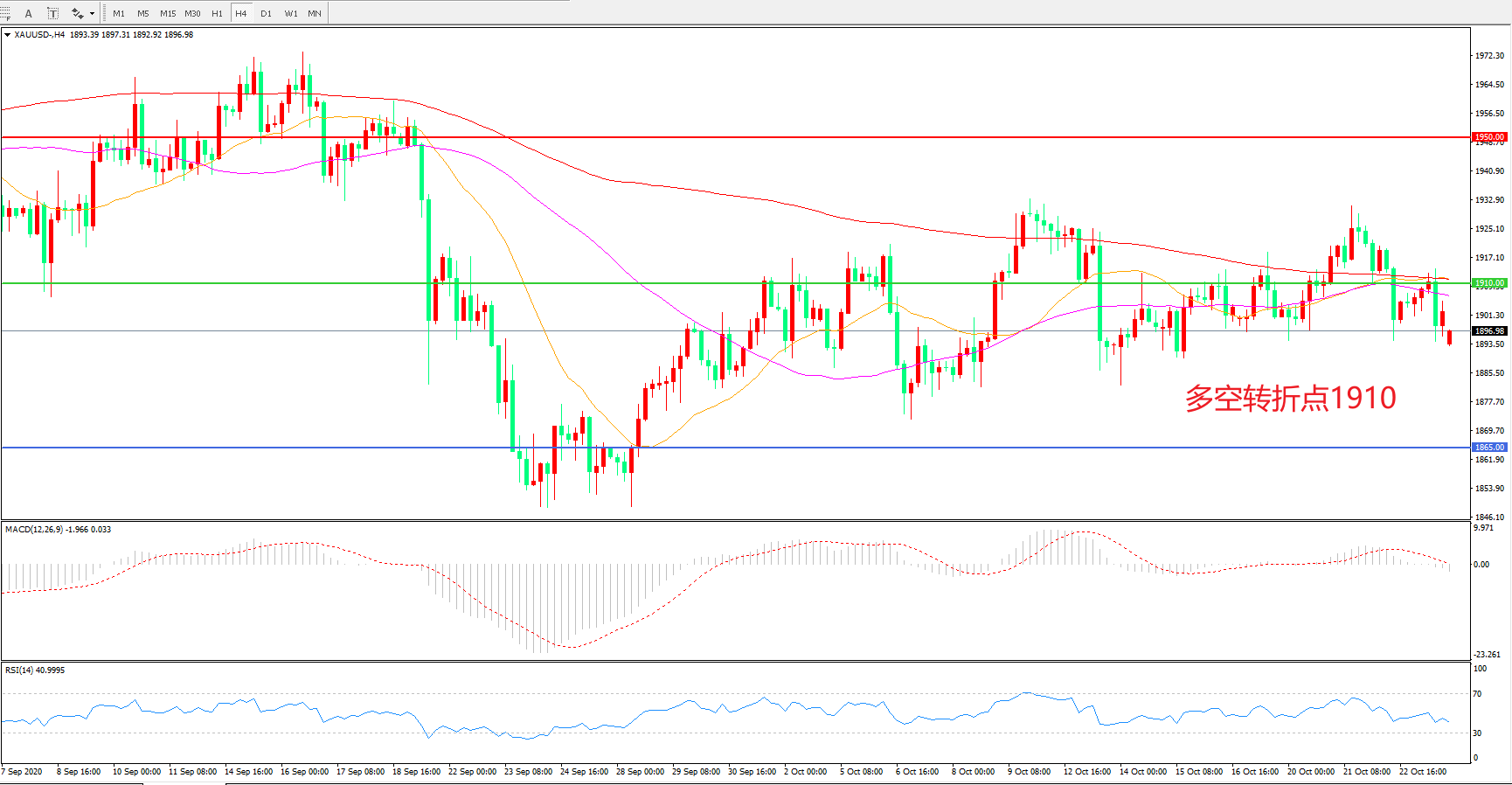 上周,美国两党刺激谈判一波三折,大选前达成协议的可能性进一步降低,对黄金形成了利空,但美元指数的大幅下跌为金价提供了反弹动能,现货黄金延续震荡,收报1902.38美元/盎司。
