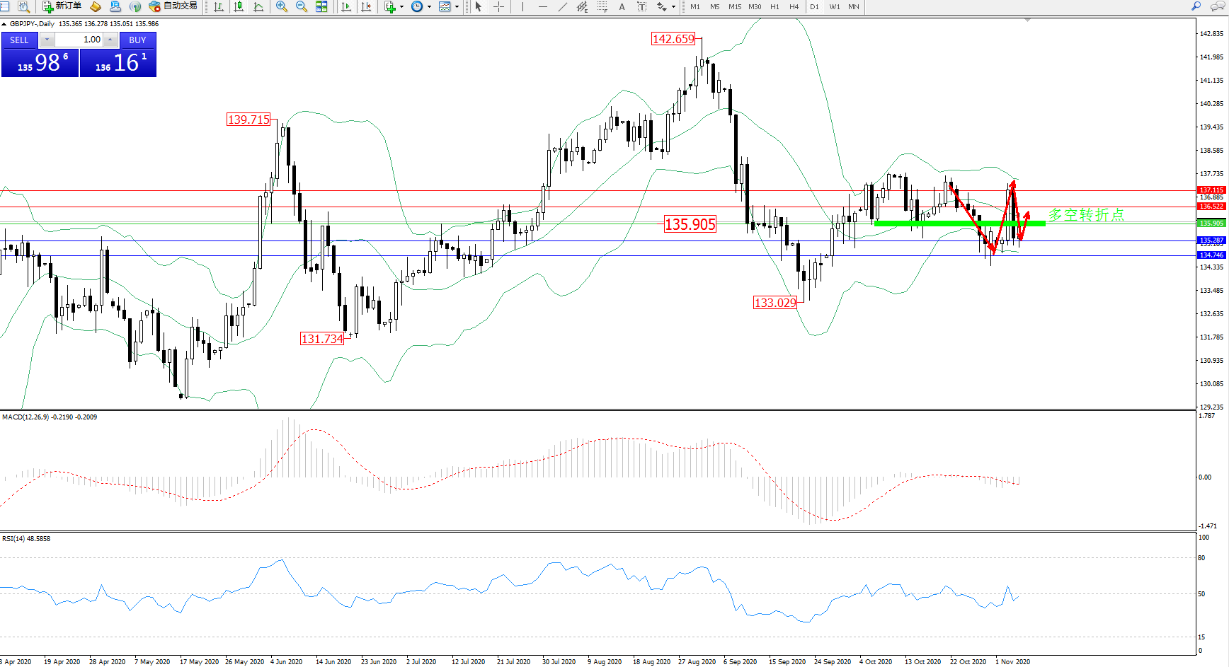 英镑兑日圆处于135.986附近整理。随着英国在英格兰地区实行封锁,花旗分析师将对英国央行在本次利率决议上扩大QE规模的预期由500亿英镑上调至750亿英镑;预计英央行可能将中小企业定期融资机制(TFSME)利率下调5-10个基点,同时放松有关银行贷款机制的条件。但如果不利情况加剧,货币政策委员会可能在年底前采取更多行动。英国央行不太可能在今天的政策会议上采取负利率政策。但英国央行可能将其量化宽松计划规模扩大1000亿英镑。虽然负利率正被考虑纳入英国央行的政策工具,但要到明年初才能使用,预计到那时也不会实施这一政策。
