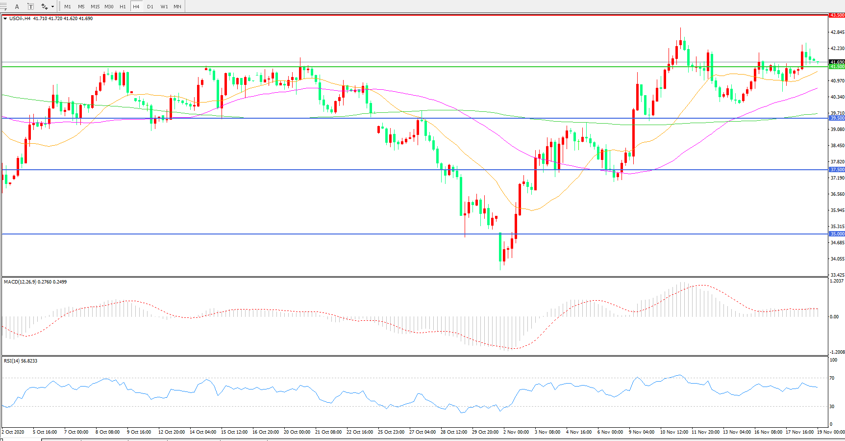 4小时图看,油价经历连续震荡,低点逐渐抬高,短期表现有所回暖,41.5成为多空分水岭,21周期均线成为短期支撑,MACD红柱增加,RSI指标走平,日内震荡上行概率较大。
