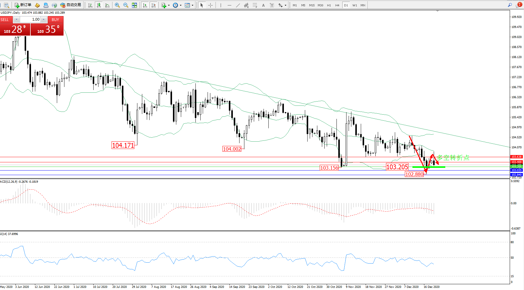 备选策略:103.205下方看跌,目标103.035、102.840