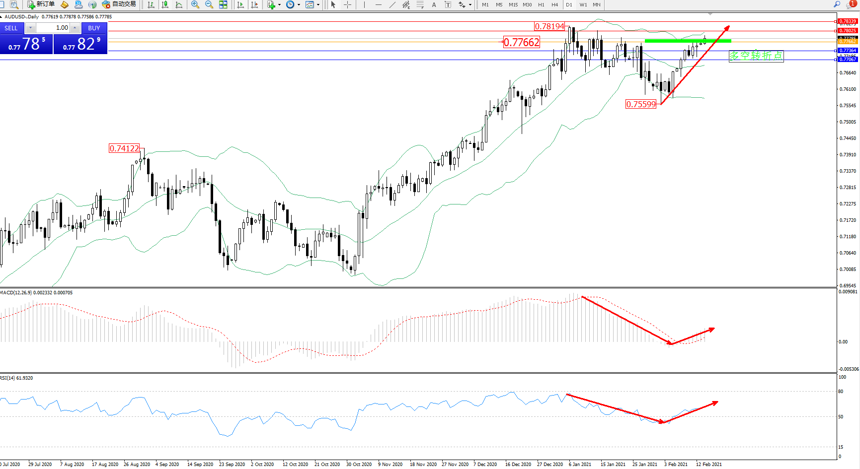 交易策略:0.77662上方看涨,目标0.78025、0.78339