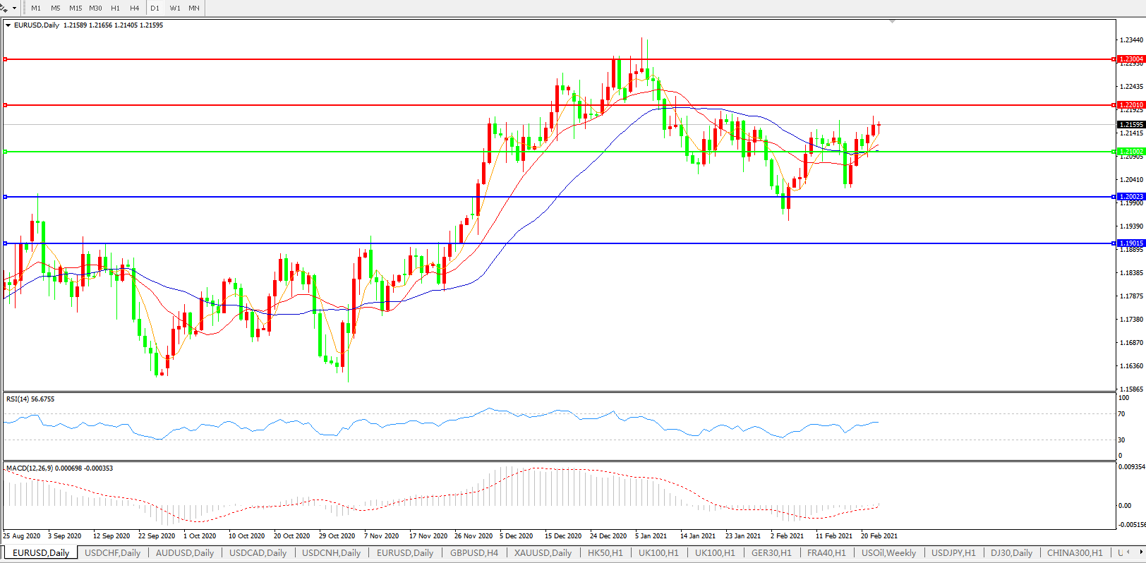 交易策略:1.2100上方看涨,目标1.2200、1.2300