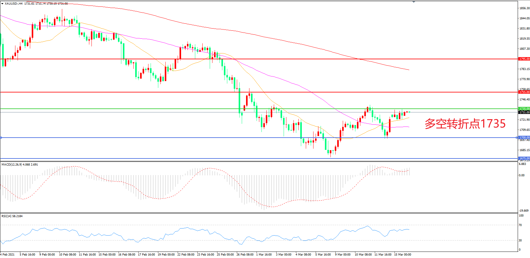 4小时图看,金价回踩1700一线后连续拉升,短期表现有所回暖,形态上有形成头肩底的可能,21均线上穿形成金叉,MACD红柱增加,RSI指标向上,日内震荡反弹概率较大。