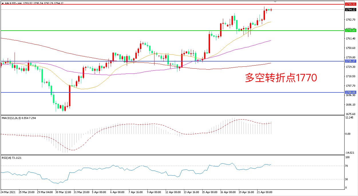 交易策略:在1770.00之上看涨,目标1800.00    1840.00