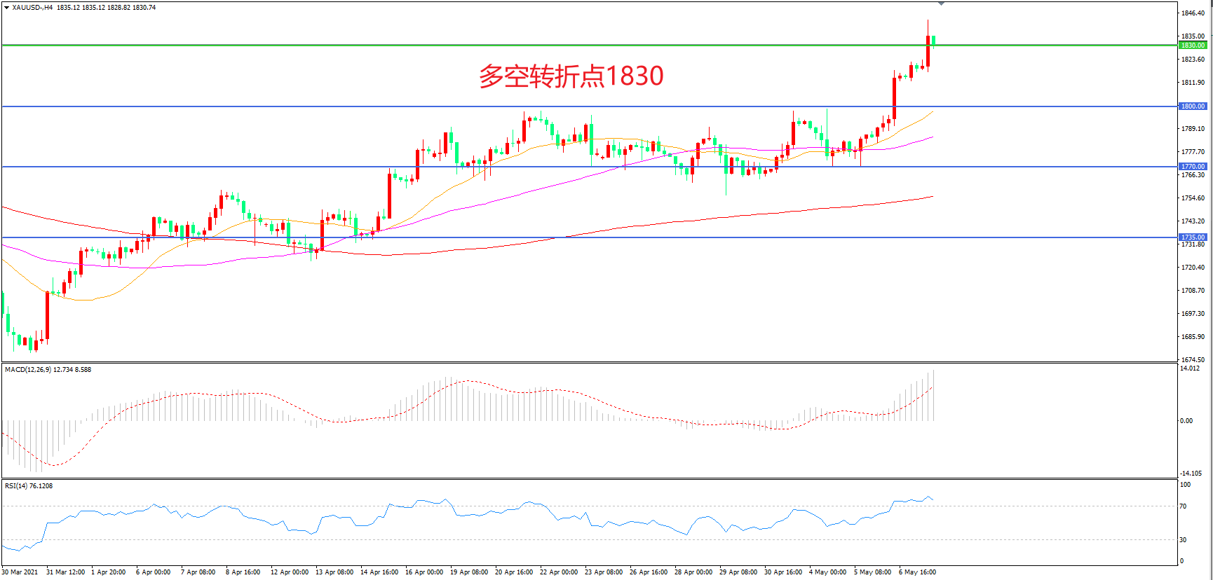 上周五(5月7日),美国4月非农就业人数录得增加26.6万人,远低于预期的97.8万人。同时,失业率从6.0%意外升至6.1%,而市场原本预期将升至5.8%,数据公布后,现货黄金短线快速拉升,一度站上1840美元,随后回落近10美元,收报1830.74美元/盎司,录得六个月来最佳单周表现。