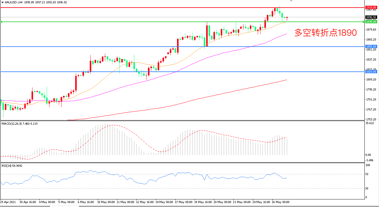 周三(526),在智库布鲁金斯学会的线上活动中,美联储负责金融监管的副主席夸尔斯在讲话中为通胀预期降温,10年期美债收益率走出近三周低谷,美元指数小幅回升,黄金在站上1900美元后未能守住这一关口,小幅回落后收报1896.04美元/盎司。日内重点关注美国的GDP修正值与初请数据,另外还有美国4月耐用品订单月率及4月季调后成屋签约销售指数出炉。