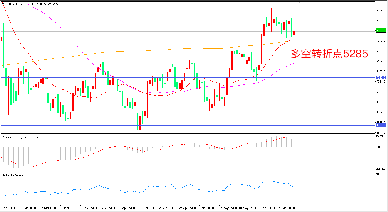 4小时图看,沪深300高位震荡后长阴下坡,短线涨势暂缓,21周期均线成为下方支撑,5285成为多空分水岭,短期均线拐头向上,MACD红柱增加,RSI指标走平,日内震荡上行概率较大。