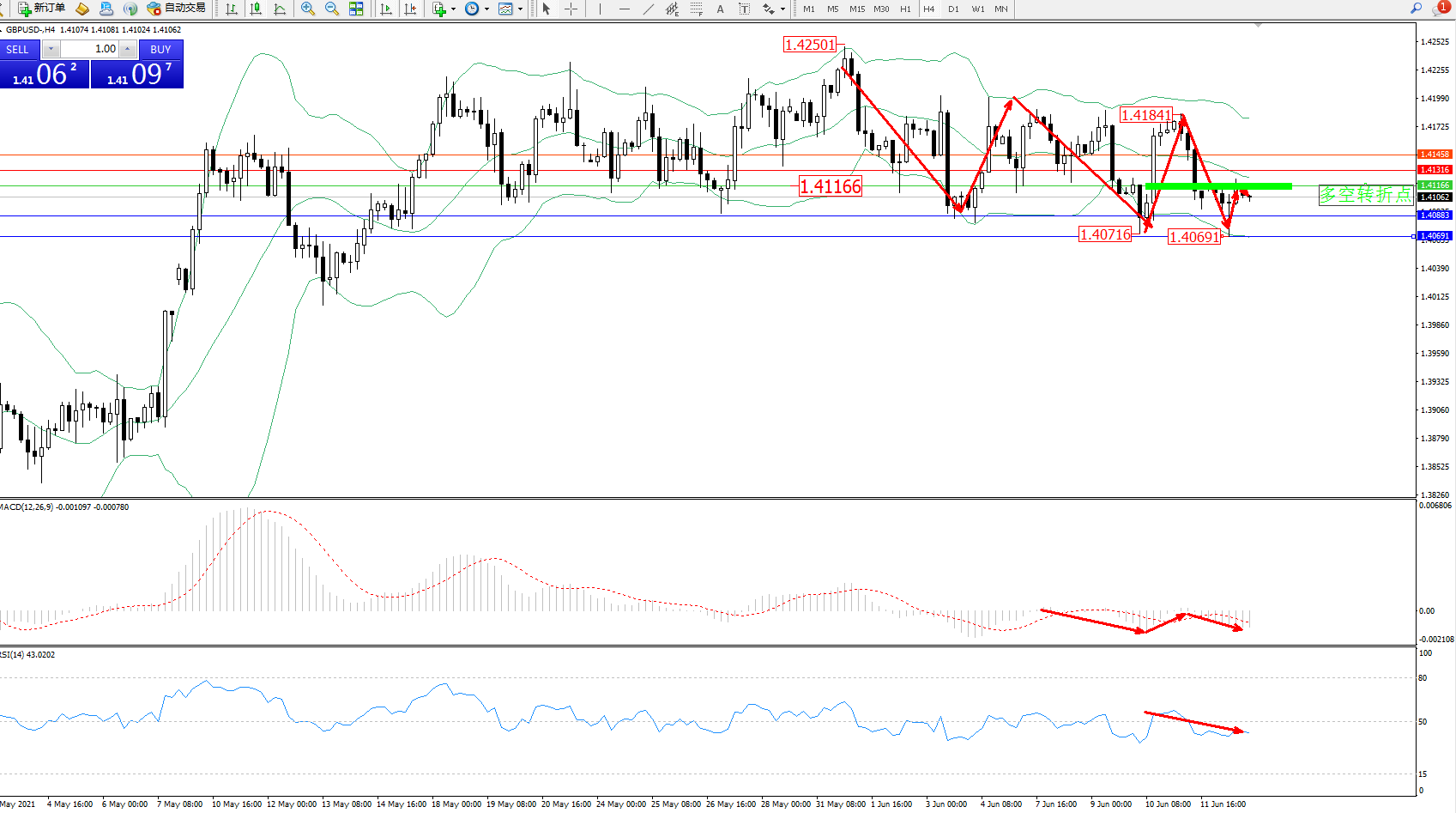 交易策略:1.41166下方看跌,目标1.40883、1.40691
