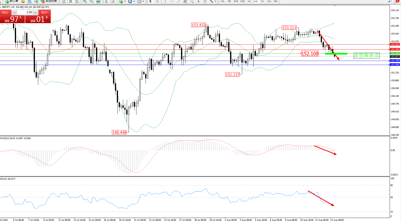 交易策略:152.108下方看跌,目标151.769、151.583