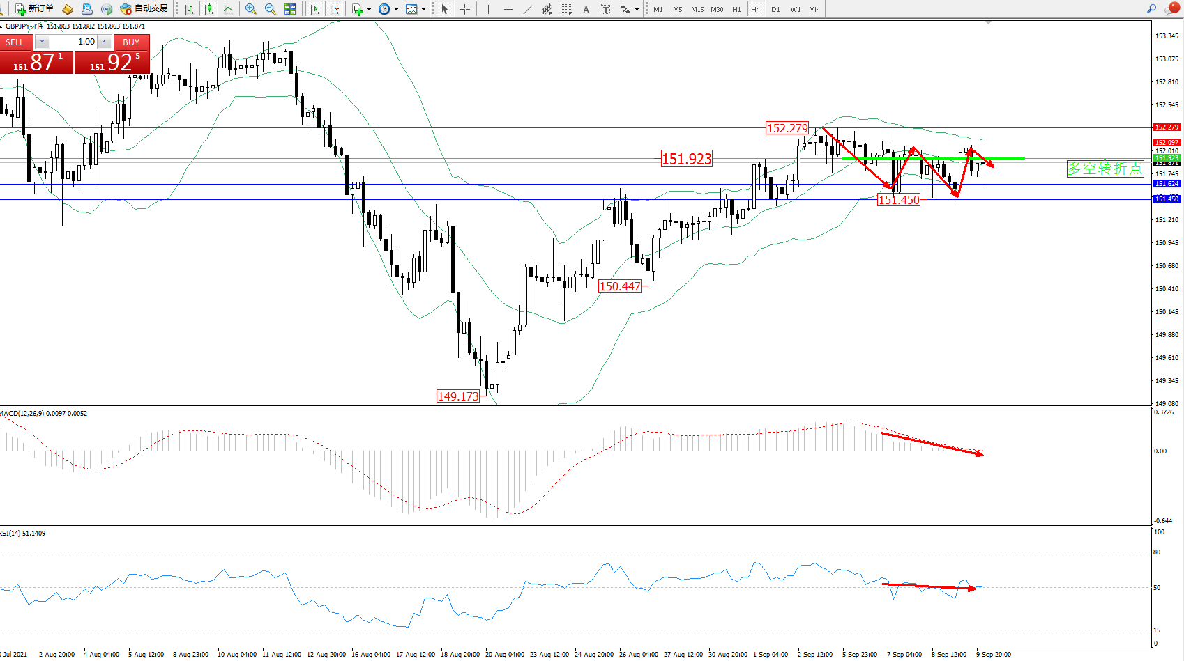 交易策略:151.923下方看跌,目标151.624、151.450