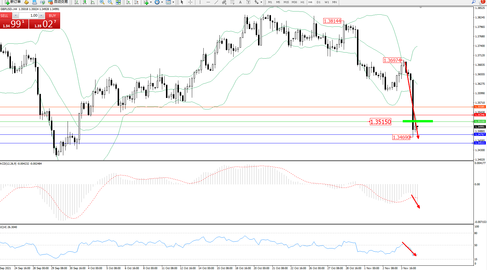 技术点评:空头动力急速下挫,低位跌破布林带指标下轨至1.34690位置节点后开始短暂整理回升,空头向下移动态势良好,短期未见有最终止步迹象,布林带指标呈张口走势持续中,MACD指标处于0轴线下方空头区域持续下挫中,RSI指标处于0轴线下方空头区域维持整理持续下行后开始平移;