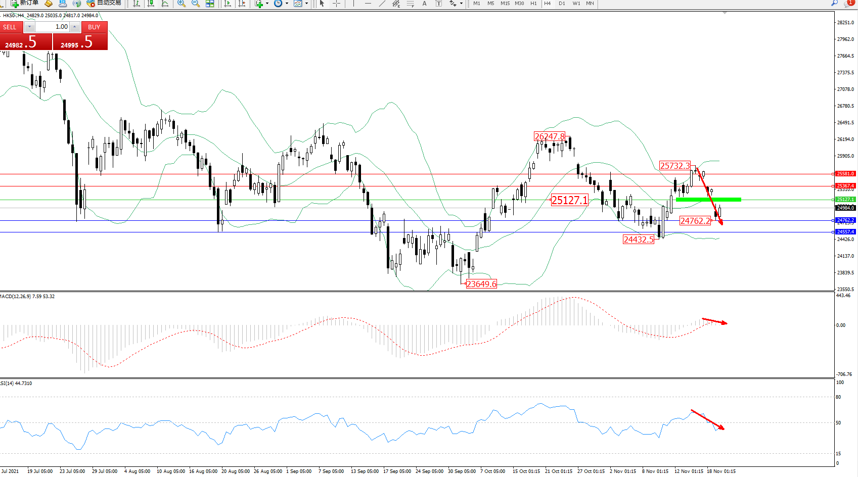 技术点评:高位空头动力持续震荡回撤,纠结于布林带通道中下轨区间整理,低位抵达24762附近徘徊,短期空头动力有继续调整迹象,布林带指标呈张口走势后开始收口,MACD指标处于0轴线上方弱势徘徊回撤,RSI指标指标空头动力持续震荡回撤至50均衡线下方徘徊;