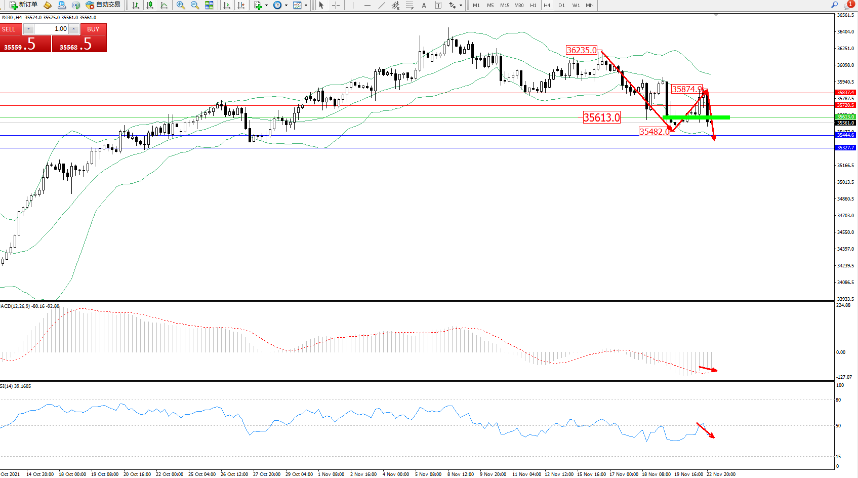 交易策略:35613下方看跌,目标35444、35327