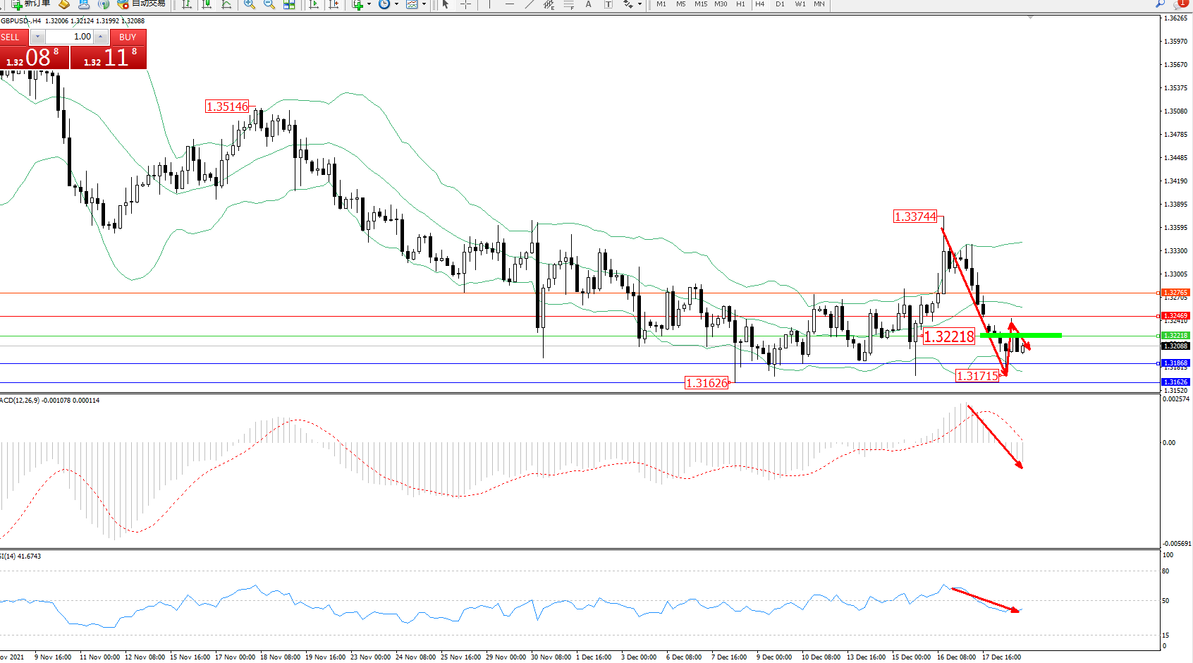 交易策略:1.32218下方看跌,目标1.31868、1.31626