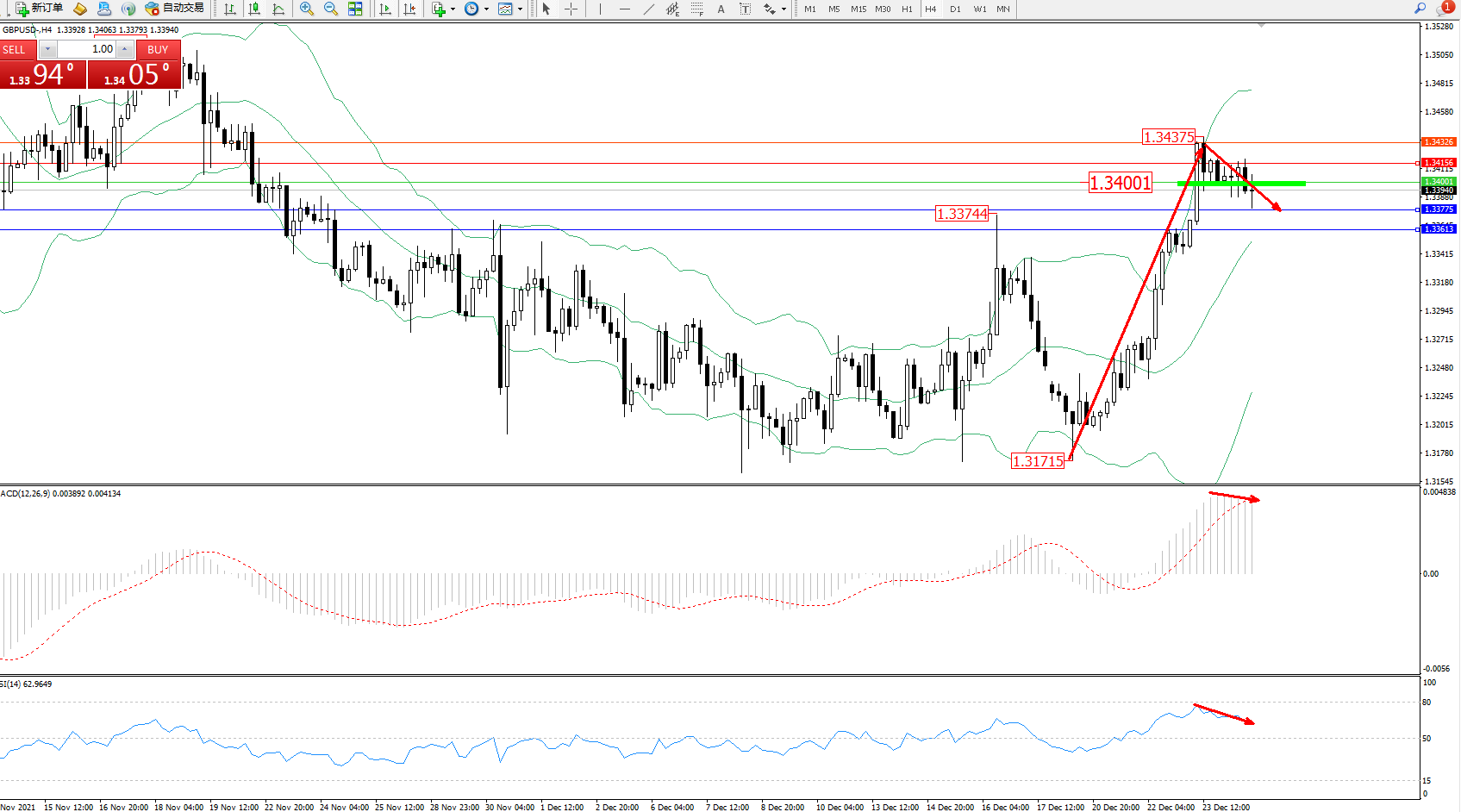 交易策略:1.34001下方看跌,目标1.33775、1.33613