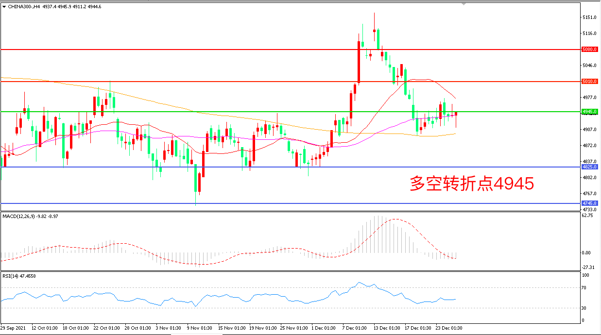 4小时图看,沪深300小幅回调后再度回升,弱势震荡迹象明显,形态上看空头趋势暂时未改,4945成为多空分水岭, MACD绿柱缩短,RSI指标走平,日内延续震荡概率较大。
