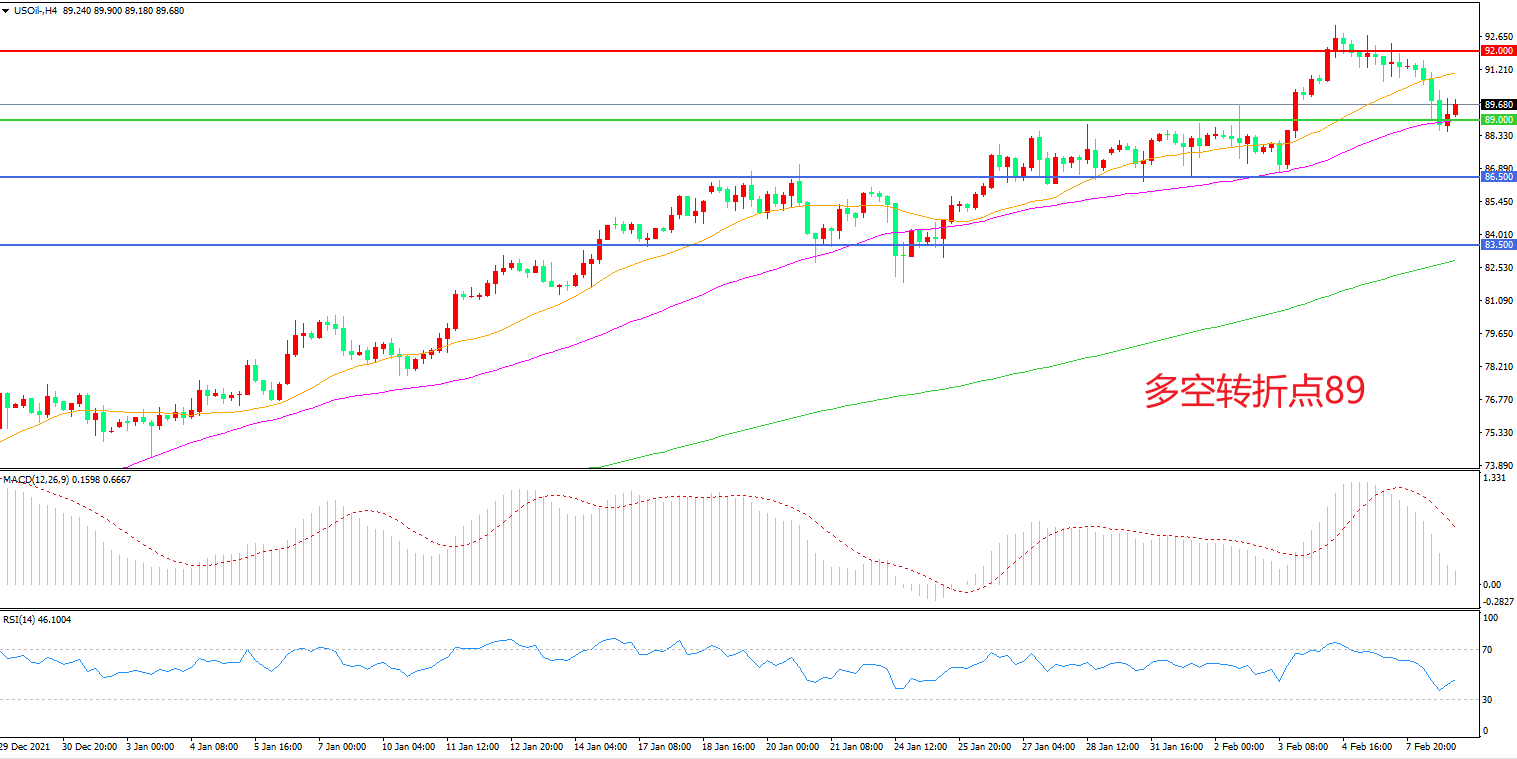 4小时图看,油价受阻于92美元后大幅回落,上行趋势暂缓,均线系统拐头向上,89美元成为多空分水岭,MACD红柱缩短,RSI指标走平,日内延续震荡概率较大。