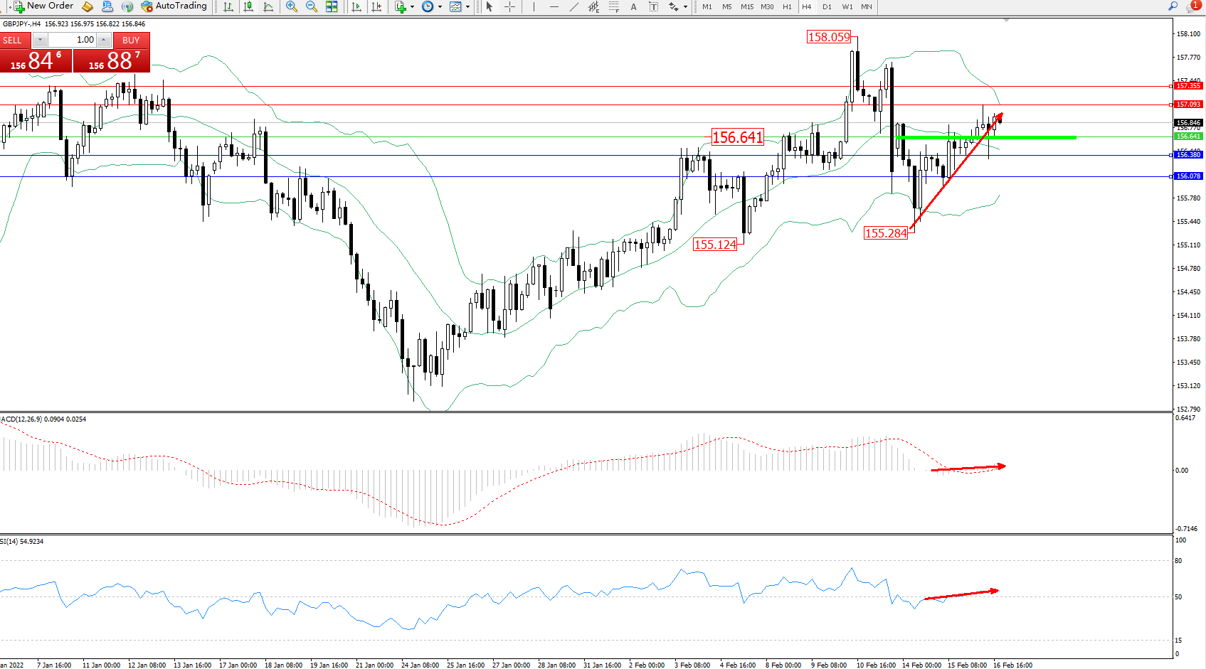 备选策略:156.641下方看跌,目标156.380、156.078