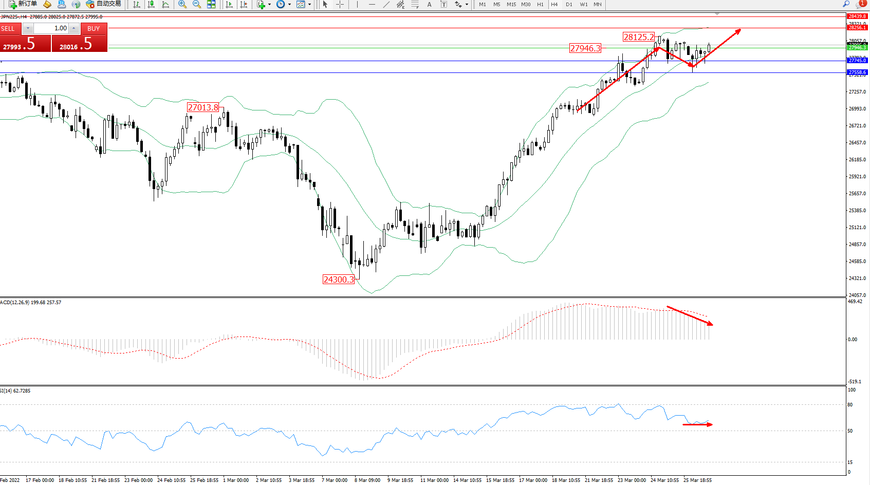 技术点评:多头动力延续布林带指标通道中上轨区间持续震荡上扬,高位抵达28125位置节点后开始维持整理平移,短期多头动力开始减弱,但市场依旧处于上行趋势走势中,布林带指标呈上行趋势走势不断上移后开始有平移迹象,MACD指标处于多头区域维持弱势缓慢下行,RSI指标处于多头区域高位整理缓慢下移后平移;