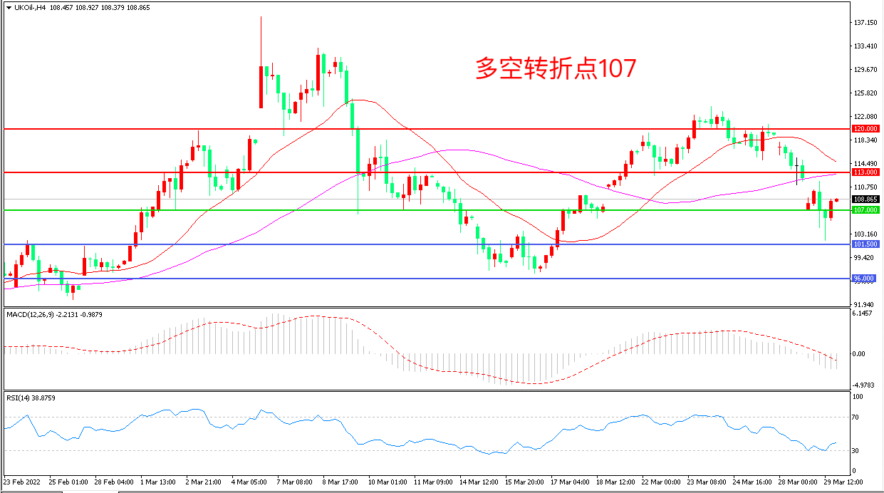4小时图看,油价连续下挫后小幅拉升,短线有回暖迹象,107成为多空分水岭,MACD绿柱缩短,RSI指标走平,日内延续震荡概率较大。