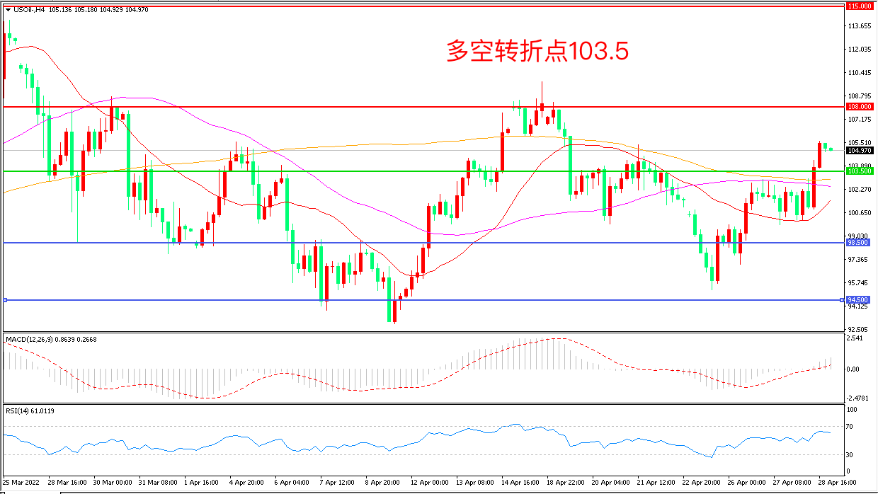 4小时图看,油价阳线连续拉升突破阻力,短线表现较强,103.5成为多空分水岭,MACD红柱增加,RSI指标走平,日内震荡上行概率较大。