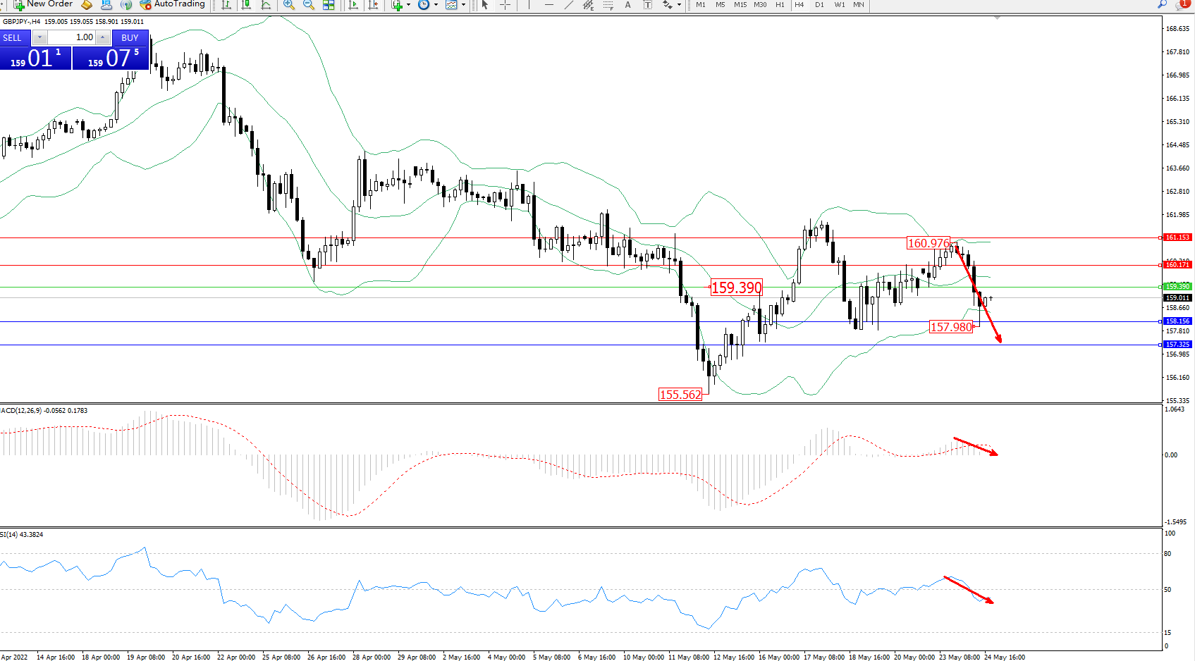 交易策略:159.390下方看跌,目标158.156、157.325