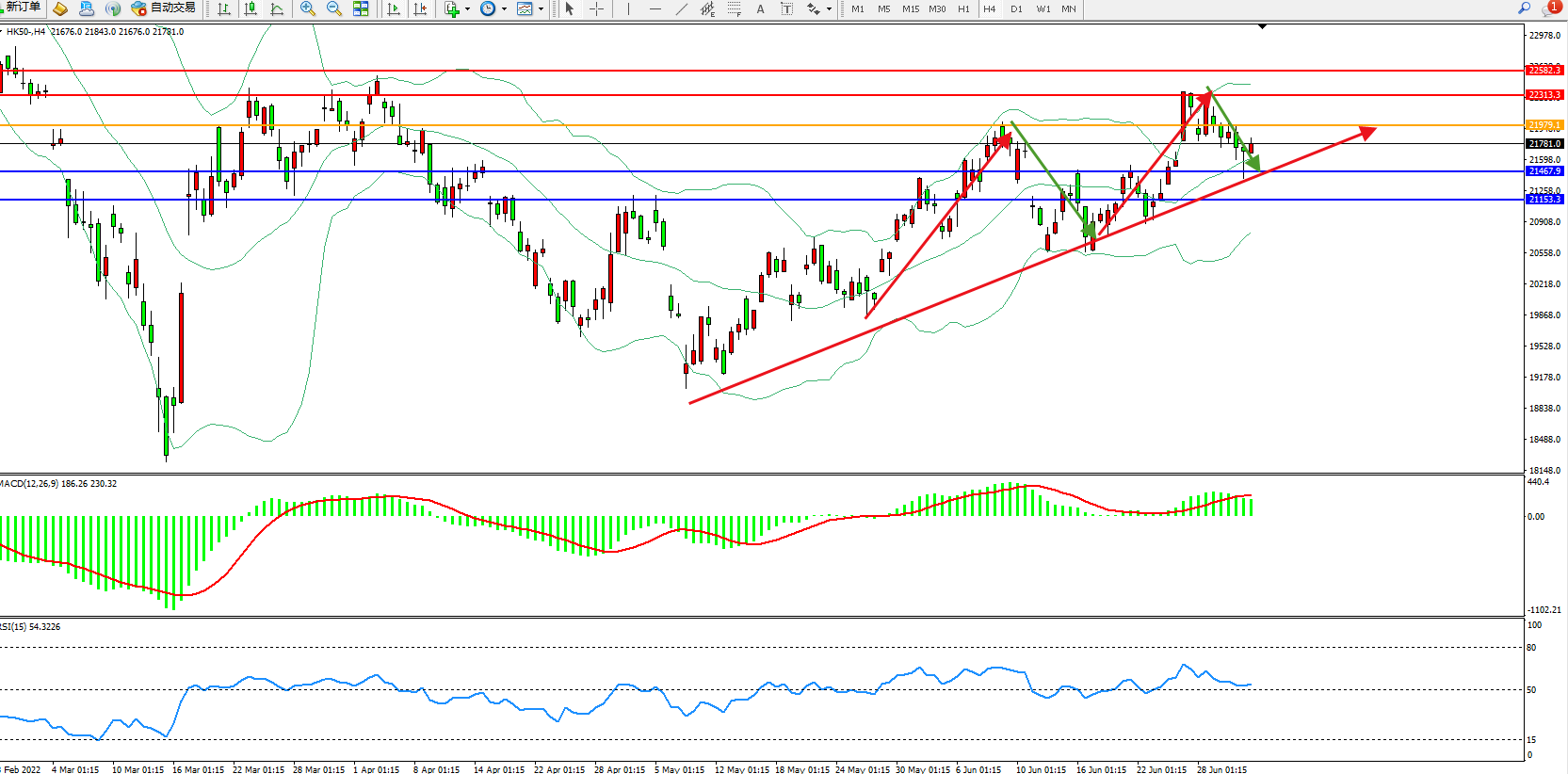 4小时图看:多头动力延续布林带指标通道内宽幅震荡向上移动,上行趋势态势了,高位多次触及上轨附近节点后遇阻短期回调,空头动力有伺机入场迹象,短期或处于高位整理走势,布林带指标呈短期收口走势中,MACD指标处于多头区域弱势整理,RSI指标处于50均衡线上側窄幅徘徊;
