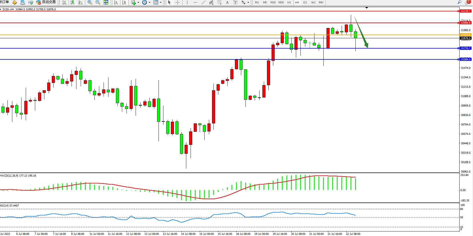 道琼斯指数DJ30——4小时K线图显示: