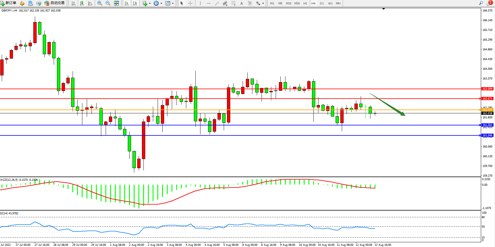 4小时图看:长时间维持窄幅整理平移,空头动力有伺机入场迹象,MACD指标处于0轴线下侧弱势徘徊,RSI指标处于50均衡线下侧窄幅整理;