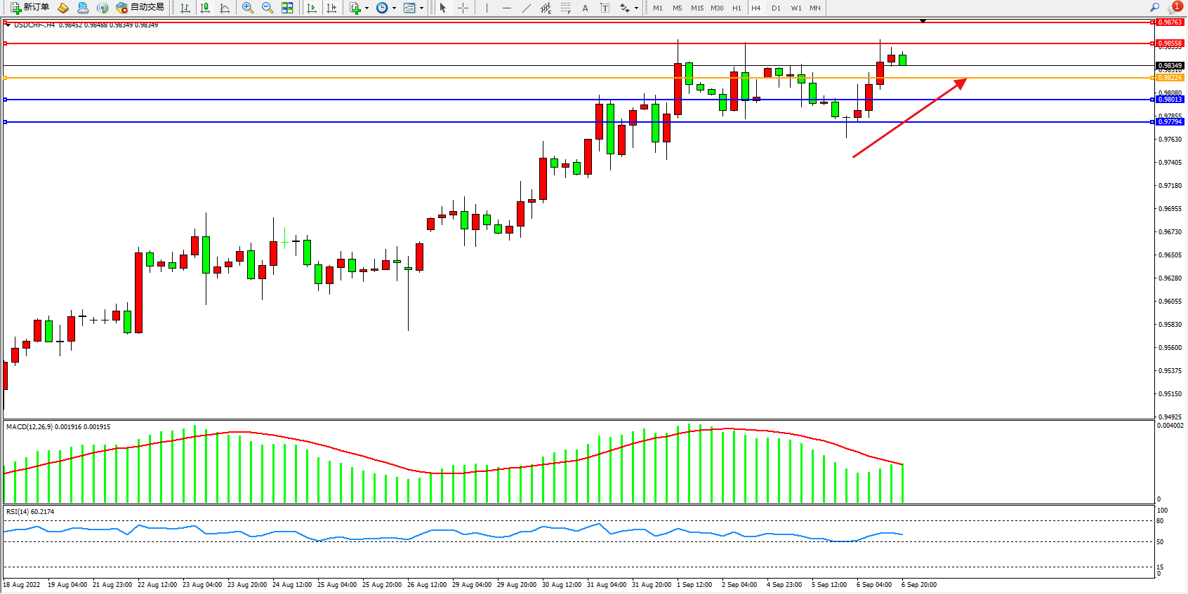交易策略:0.98224上方看涨,目标0.98558、0.98763